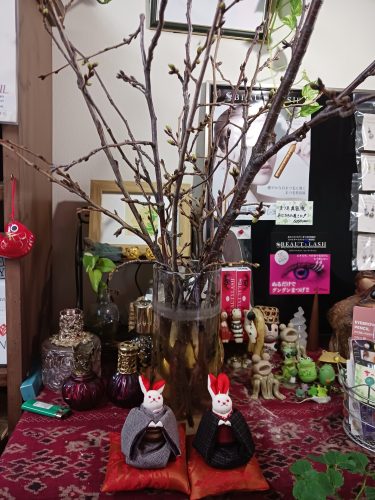 今日はひな祭り雨で寒い一日です・・・ お客様からの頂き物の雛飾りと桜の枝~桜は蕾...